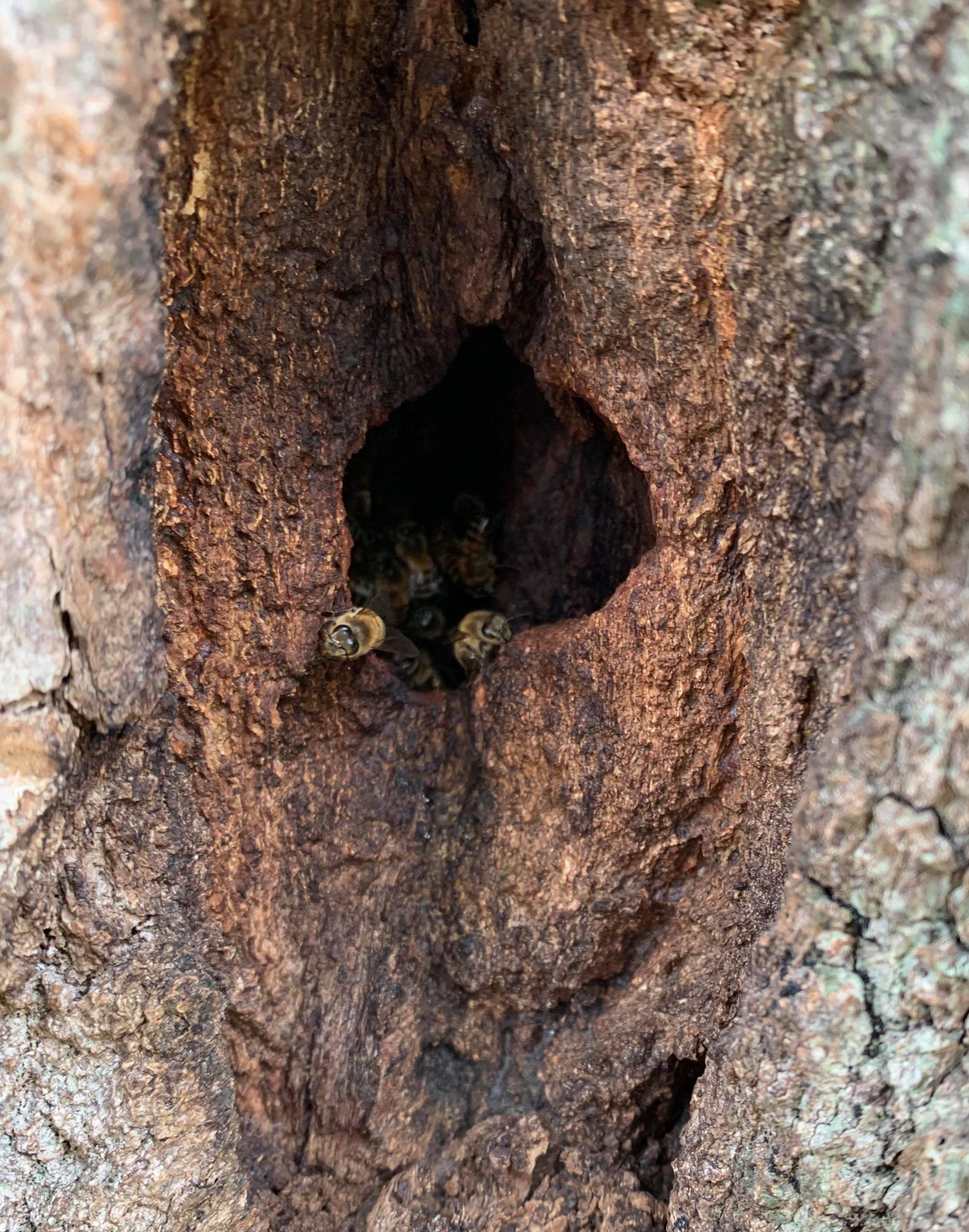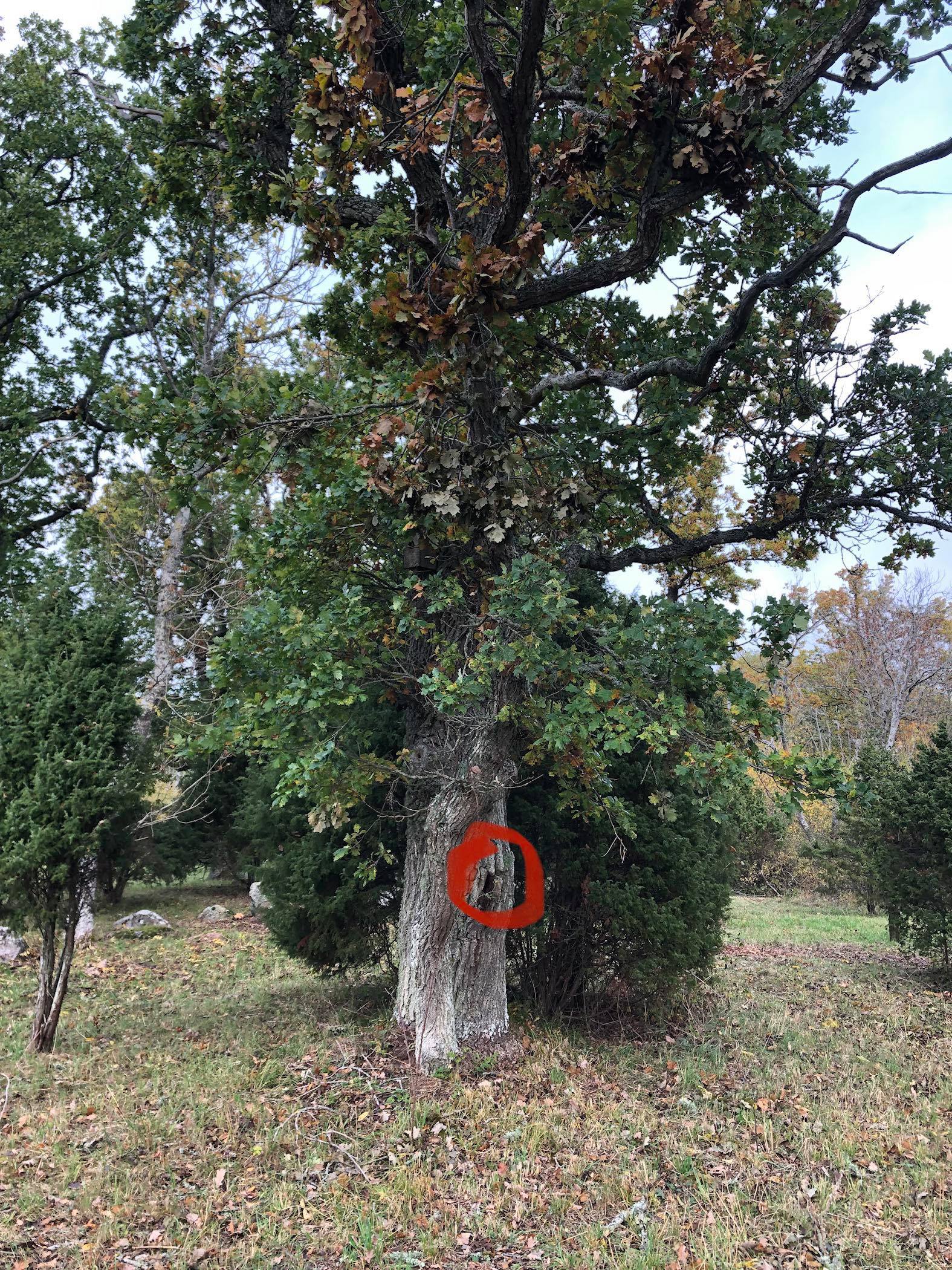 Ytorna i det ihåliga trädet är allt annat än jämna och släta vilket stimulerar bina att propolisera dem. Propolis görs av harts, kåda och vax och motverkar bakterier, svampar och virus. Mer propolis har visat sig leda till friskare bin. Den röda färgen runt ingången vid denna vackra ek gör namngivningen av denna viktiga biprodukt alldeles självklar – propolis betyder ”innanför samhället”.